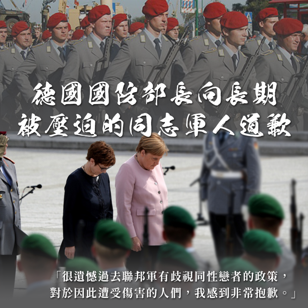 其實今年七月德國才向長期被壓迫的同志軍人正式道歉,日前一份研究顯示1955 – 2000年間德軍對同性戀者存在「系統性歧視」,國防部長再次表示歉意,並指將在近期提出草案,解決同志軍人長期受到不平等對待的問題。